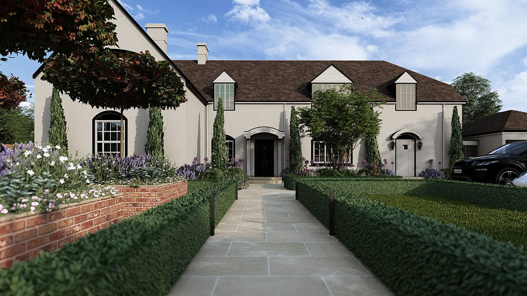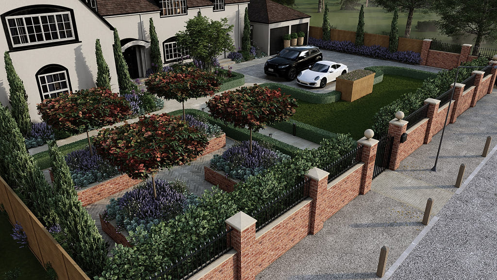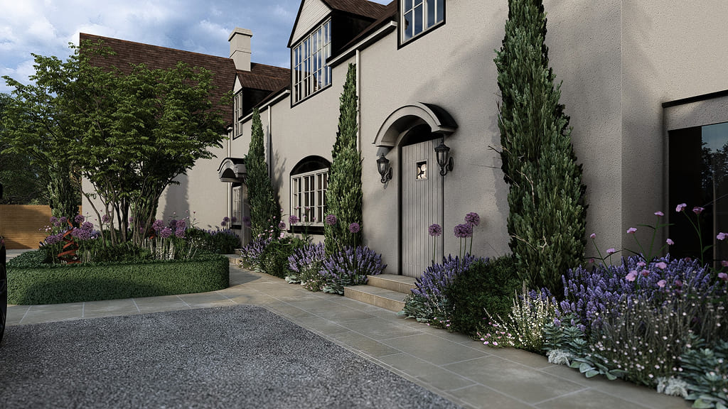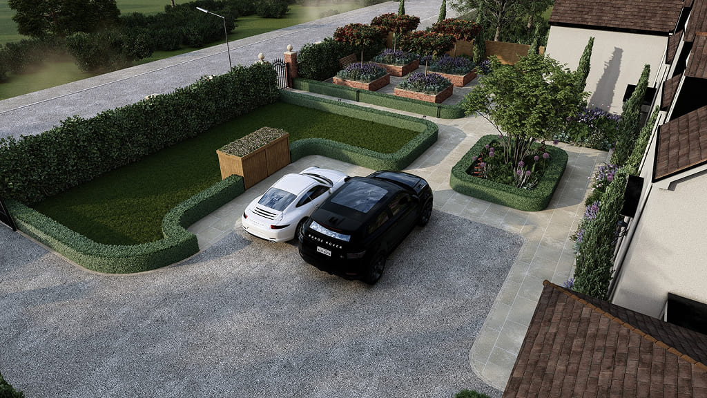 We used a west hoathly brick with a detailed finish around the perimeter of the driveway to match the house and keep it authentic to the property. A lighter driveway block was used and we contrasted this with a charcoal kerb kicker. We finished the drive with an evergreen planting scheme to give colour all year round